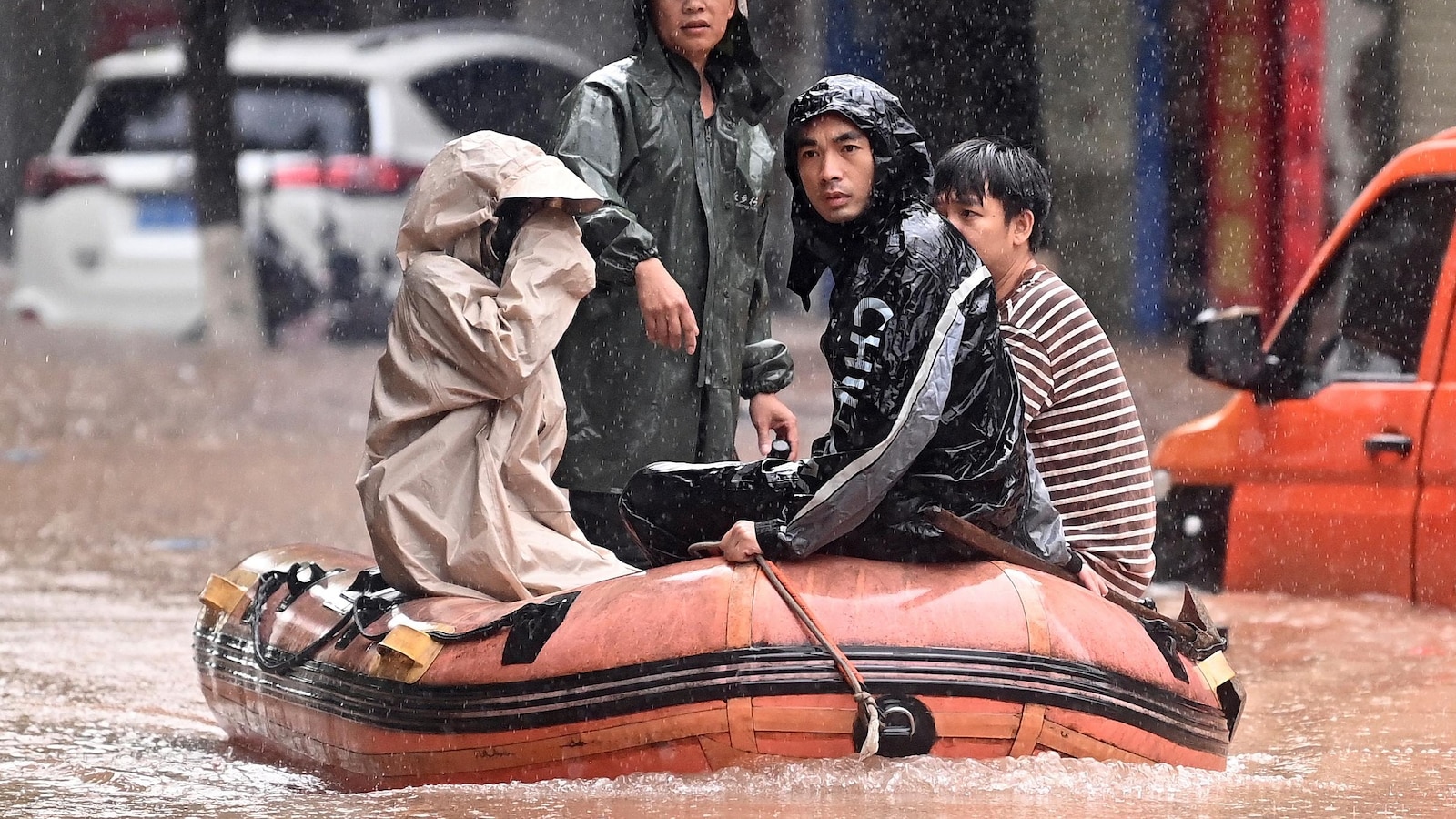 في هذه الصورة التي نشرتها وكالة أنباء شينخوا، يتم إجلاء السكان الذين تقطعت بهم السبل على متن قارب بعد الفيضانات الناجمة عن الأمطار الغزيرة في تشينتشو، منطقة قوانغشي ذاتية الحكم لقومية تشوانغ بجنوب الصين، الاثنين 27 أبريل 2026. (Zhang Ailin / AP عبر شينخوا)